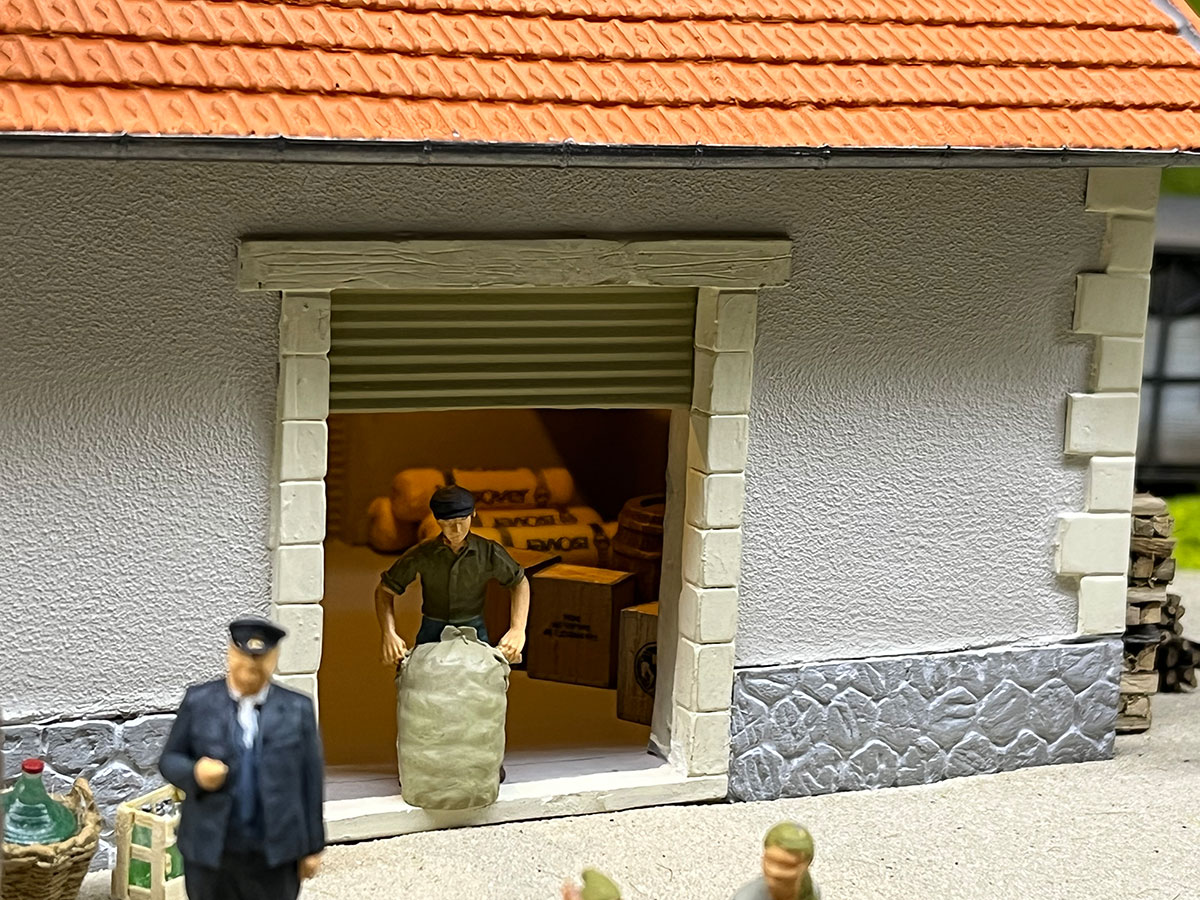La Dame-jeanne, la caisse avec les bouteilles, les rouleaux Isover et les sacs postaux dans la hall marchandises sont de fabrication Paulo (Allemagne); malheureusement il a cessé son activité en 2019. Addie Modell a aussi bien réduit sa production.